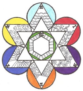 La stella di Davide e’ formata da due triangoli: uno che punta verso il basso, verso la terra, e un altro che punta verso l’alto, verso lo spirito. Nelle sei punte della stella e nel centro, sono collocate in tutto sette energie, che sperimentiamo come sfide, come talenti e come goals. Sono tutte presenti, sempre, in ogni momento della nostra vita, strettamente connesse l’una all’altra, ma ci sono certe fasi della vita in cui alcune di esse si fanno sentire di piu’. Tradizionalmente i talenti sono cio’ in cui siamo bravi, innatamente, e sono la chiave per superare le sfide, o conflitti, e raggiungere i nostri goals.